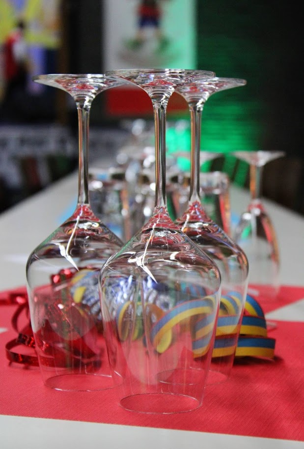 Freunde trinkt die Gläser leer ha ha ha ha ha hey!" (cf)